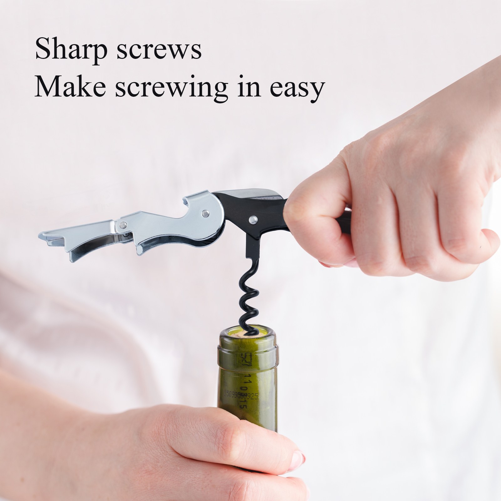 3-in-1 Corkscrew: This corkscrew wine opener works very well for opening both wine bottles and beer bottles, as well as bottles that need the lid popped off. Its small size is perfect for putting in your pocket or apron. It includes a foil cutter to remove wine labels, and cork screw wine bottle opener can also be used as a tool for unwrapping packages. The curved edge can be used as a beer bottle opener when it's folded up. This wine opener manual is one of the essential bartender accessories.